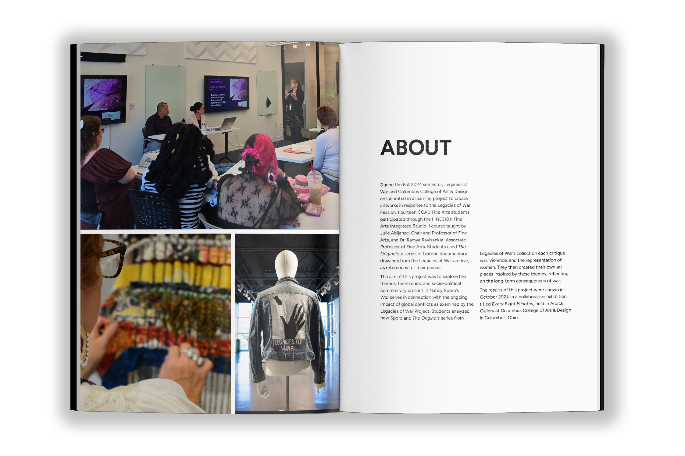 Going through five rounds of revisions, I created the layout design for all pages and the cover design under the direction of representatives from Legacies of War, CCAD’s Careers & Collaboration Department, & the Fine Arts department.